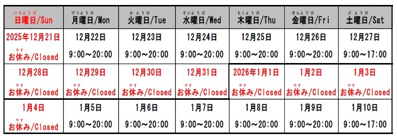 2025年12月28日(日曜日)から2026年1月4日(日曜日)までお休みです。